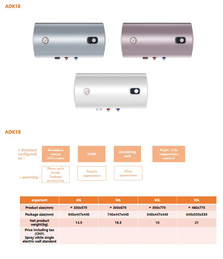 | Product function introduction | Basic configuration: enamel inner tank, front knob mechanical temperature control, water temperature indicator inner tank temperature, heating lamp indicator, 2200W single power, independent sewage outlet, built-in anti-electric wall; Protection against overpressure/overtemperature/dry burning. | ||||||||