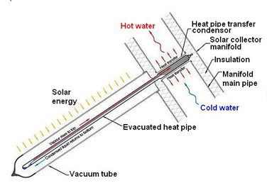 Vacuum tube absorb solar energy and transfer to heat pipe via aluminum fin, heat pipe is heated and working liquid vaporize and rise to the top heat pipe condenser (condenser is inserted into the mainfold port inside the solar collector manifold), when the heat pipe condenser meet cold water flow inside the manifold port, the working liquid will cool down andfluidify return to the bottom of heat pipe, so once and once again repeat this process, so finally cold water(glycol) inside the manifold port will be heated.